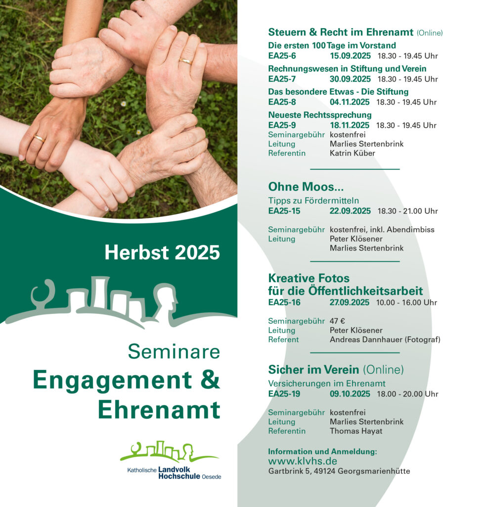 Unter dem Motto Steuern und Recht im Ehrenamt werden folgende Seminare angeboten: