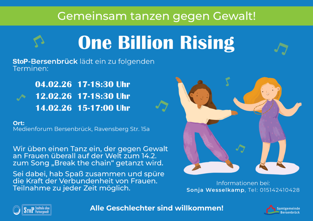 Als Mentorin für das StoP-Projekt – Stadtteile ohne Partnergewalt – setzt sich Sonja Wesselkamp im Rahmen der Gemeinwesenarbeit in der Samtgemeinde Bersenbrück seit dem vergangenen Jahr verstärkt für dieses Thema ein. Mit dieser Aktion will sie ein bewusstes und aktives Zeichen setzen und hofft auf viele Gleichgesinnte. „Schon 2025 war die Motivation der teilnehmenden Frauen großartig. Das wollen wir auch diesmal wieder gemeinsam erleben. Die ernste und deutliche Botschaft von One Billion Rising wollen wir mit Temperament und Leidenschaft im Tanz verdeutlichen“, lautet das klare Statement von Sonja Wesselkamp.