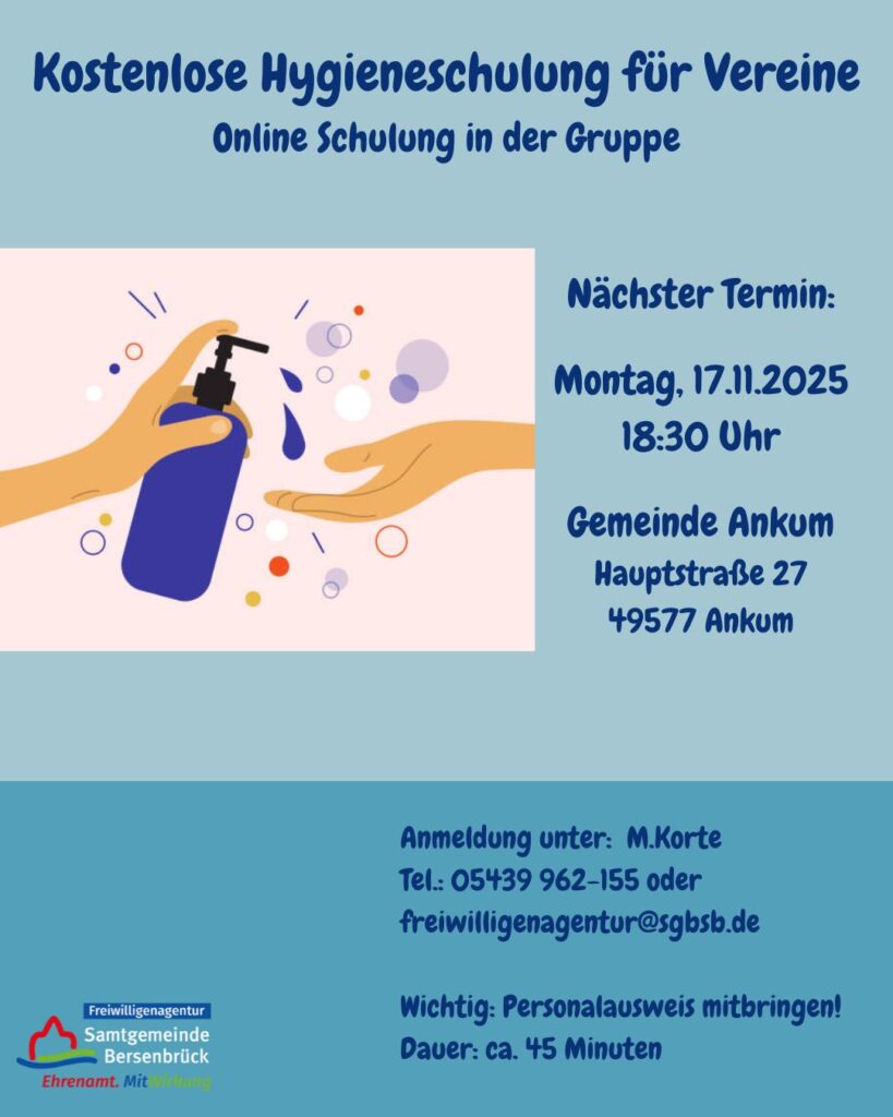 In regelmäßigen Abständen bietet die Freiwilligenagentur der Samtgemeinde Bersenbrück kostenlose Hygieneschulungen für Ehrenamtliche in Vereinen an.