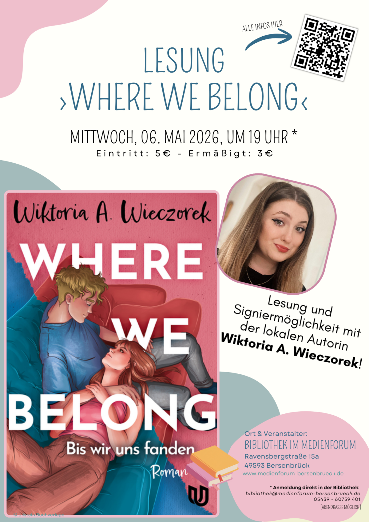 Am Mittwoch, 6. Mai um 19 Uhr liest die junge Autorin Wiktoria A. Wieczorek (Pseudonym) aus ihrem Jugendroman „Where we belong – Bis wir uns fanden“ im Medienforum in Bersenbrück vor.