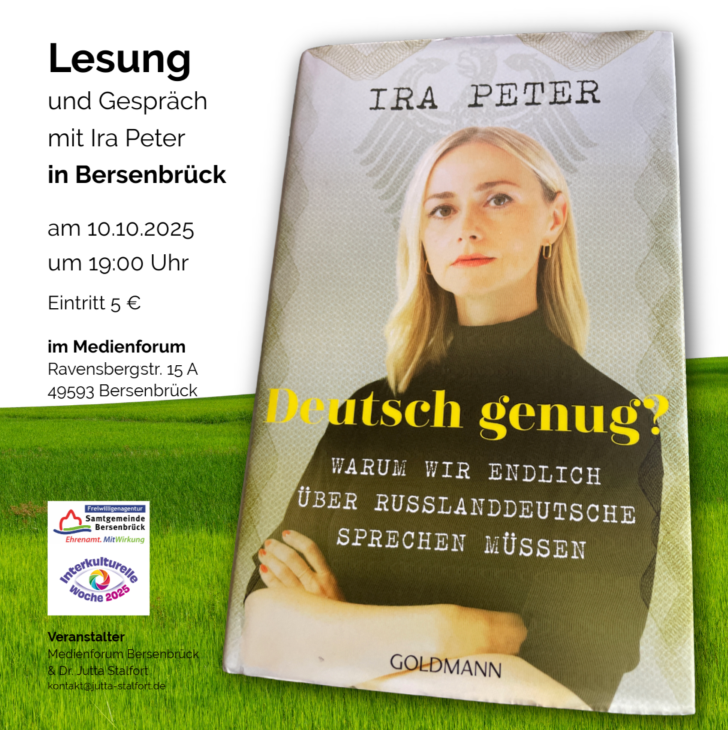 Am Freitag, 10. Oktober um 19 Uhr stellt die Journalistin und Autorin Ira Peter ihr Buch „Deutsch genug? Warum wir endlich über Russlanddeutsche sprechen müssen“ im Medienforum in Bersenbrück vor.